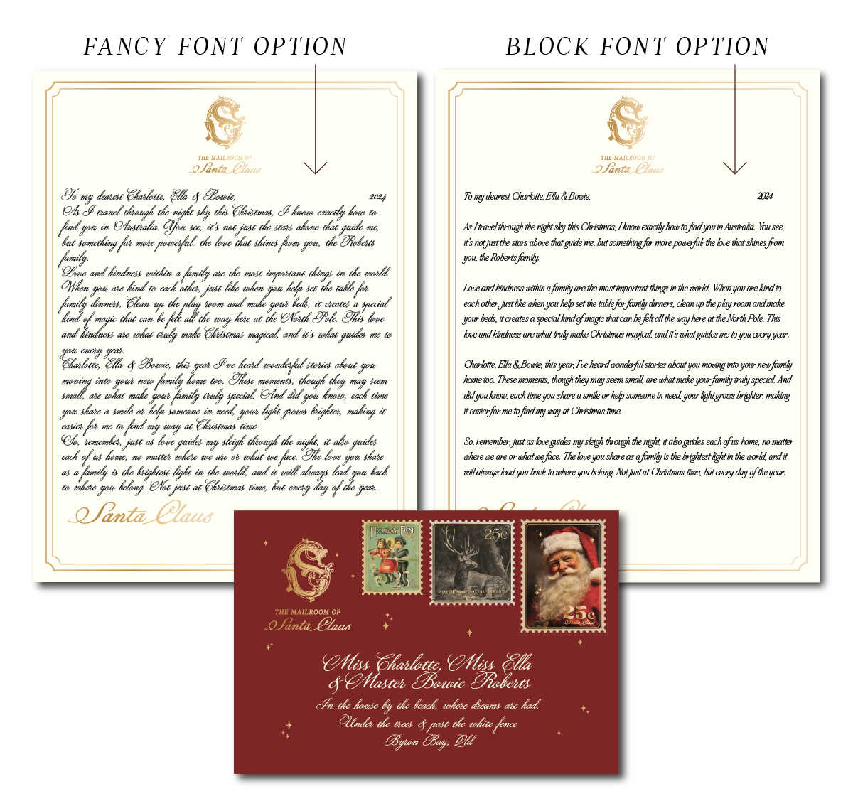 Imagine your child waking up on Christmas morning only to discover Santa Claus has left them a Christmas letter. These are not just any Santa letters, they focus on kindness and values, not toys. For families with multiple children, choose from 4 unique templates, each personalised with names, achievements/characteristics, and heartfelt notes. Celebrate your child's magic and milestones with a moment they'll look forward to every Christmas.